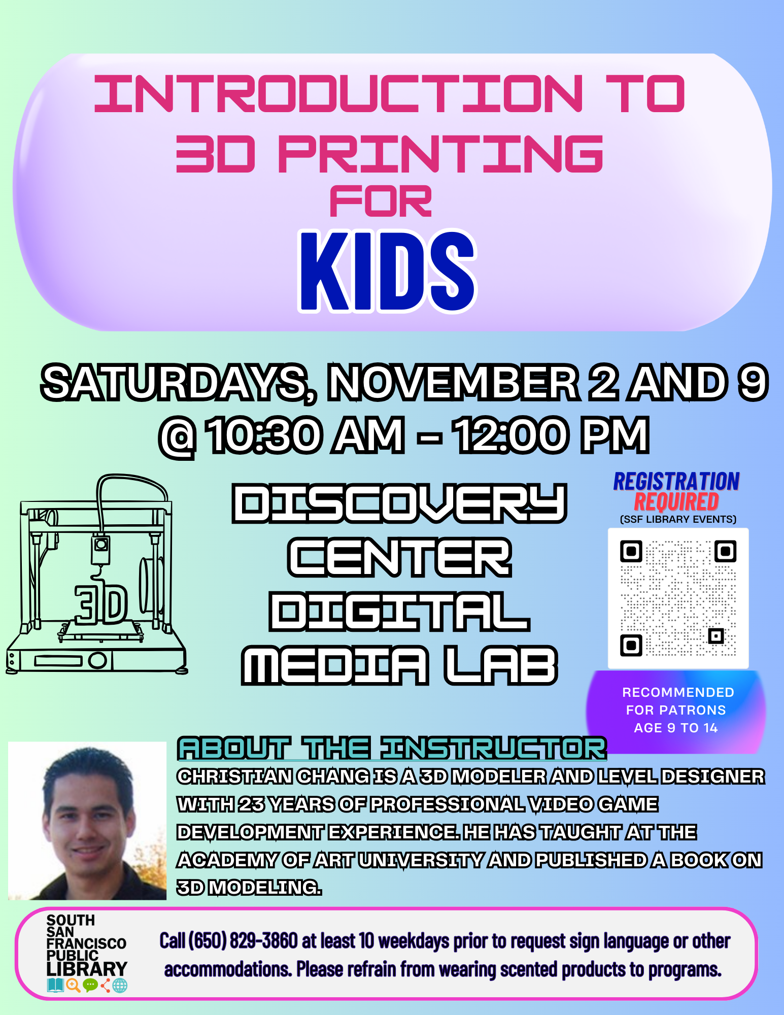 In this class you will learn the basics of 3D printing and how to use 3D modeling software to create your own designs. This program is recommended for patrons age 9 to 14.